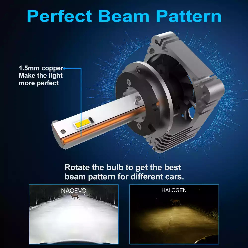 تمكن مصابيح LED D1 من NAOEVO من إضاءة الطريق على الفور دون أي وقت للتسخين، حيث تصل إلى الإخراج الأقصى في أقل من 0.01 ثانية. يمكنك الحصول على المزيد من الوقت للتفاعل مع العقبات المحتملة باستخدام هذه اللمبة عالية الأداء لمصابيح LED D1.
