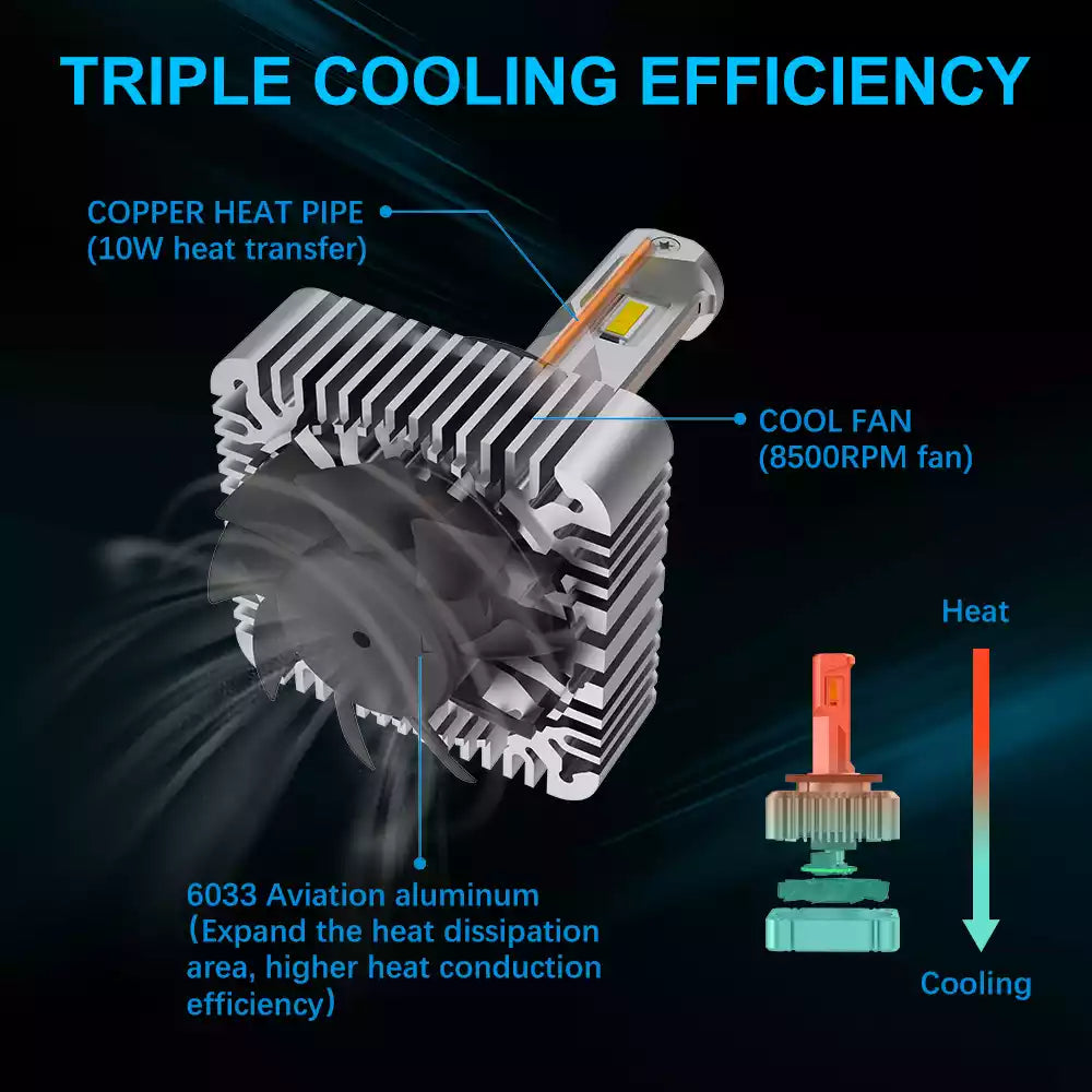 تتمتع مصابيح LED D1 Plus بنظام تبديد حراري فعّال. يساعد أنبوب الحرارة النحاسي في نقل 10 واط من الحرارة في كل مرة، ثم يتعاون مع مروحة صامتة عالية السرعة بسرعة 8500 دورة في الدقيقة ومساحة كبيرة من الألمنيوم، لتحقيق هذه اللمبات نظام تبريد فعّال. كما تمتلك مستشعر حراري مدمج يمنع اللمبة من السخونة الزائدة. وبالتالي، تضمن هذه اللمبات D1 Plus إضاءة أكثر استقرارًا وعمرًا طويلا يتجاوز 50,000 ساعة.