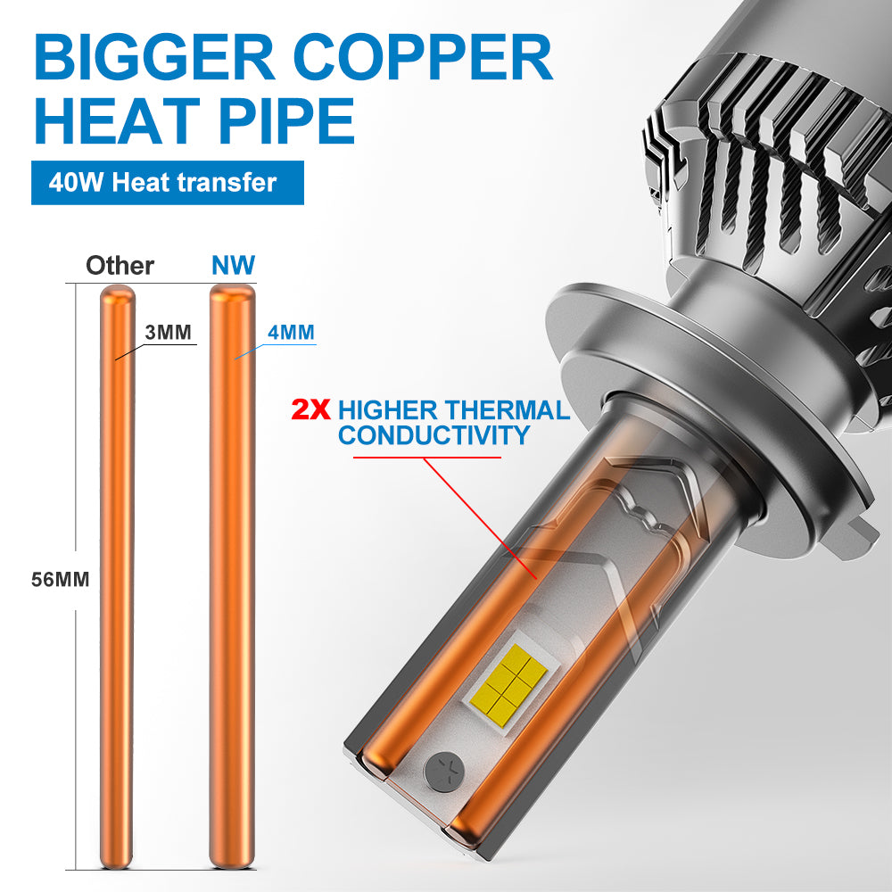 تأتي مصابيح NW LED بأنابيب حرارية مزدوجة من النحاس بحجم 4 ملم و3 ملم، قادرة على نقل حرارة تصل إلى 30 واط في كل دورة.