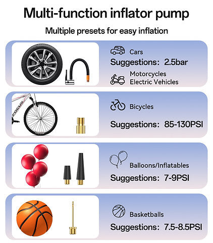 - الوظائف: تدوير السيارة + نفخ الكفرات + قياس ضغط + كشاف + شاحن جوال.