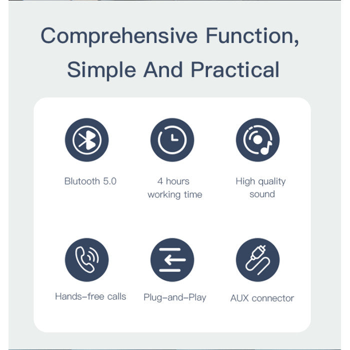 تم تصميم هذه الوصلة لتكون الحل الشامل والعملي لك. بفضل تقنية بلوتوث 5.0، تضمن لك اتصالاً مستقراً وصوتًا عالي الجودة. ومع بطارية تدوم حتى 4 ساعات من التشغيل المتواصل، يمكنك الاستمتاع برحلاتك الطويلة. بالإضافة إلى ذلك، تتيح لك خاصية المكالمات بدون استخدام اليدين إجراء محادثاتك بأمان ووضوح. كل هذا مع سهولة مطلقة في الاستخدام، فقط قم بتوصيلها بمدخل AUX وابدأ التشغيل فورًا بدون أي تعقيدات.