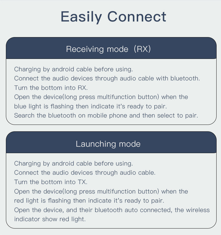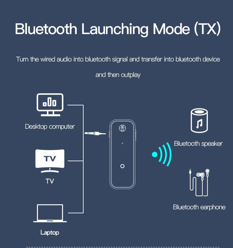 - وضع الإرسال (Transmitter Mode): تقوم بأخذ الصوت من الأجهزة السلكية (تلفزيون، كمبيوتر) وتحويله إلى إشارة بلوتوث.
